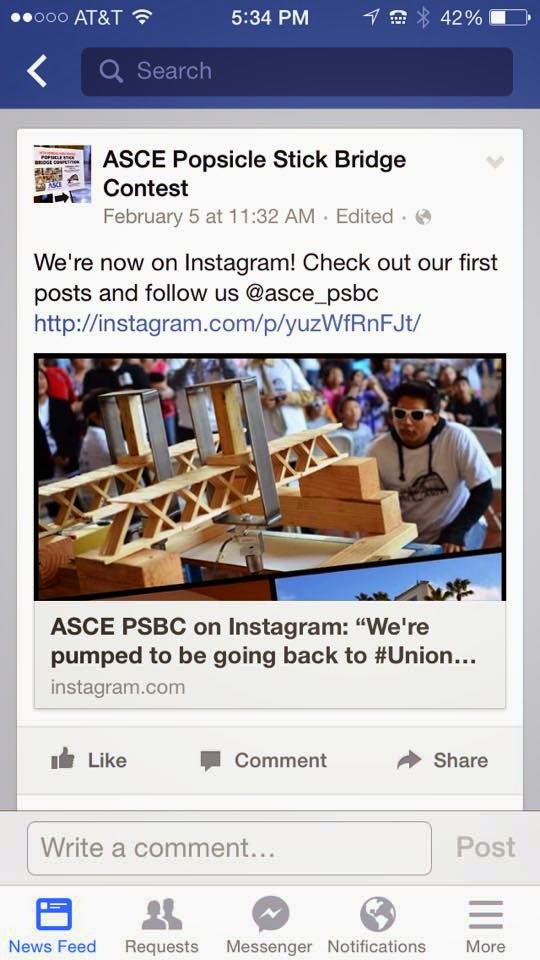 @ 21st American Society of Civil Engineers Popsicle Stick Bridge Contest (Feb 28) Posted by Walter on March 09, 2015 Get link Facebook X Pinterest Email Other Apps Belmont's SAGE Academy lands 2nd place in OVERALL category!!! Belmont/SAGE alumni Luis Arrieta (now in CSUN's Engineering program) observes contest!